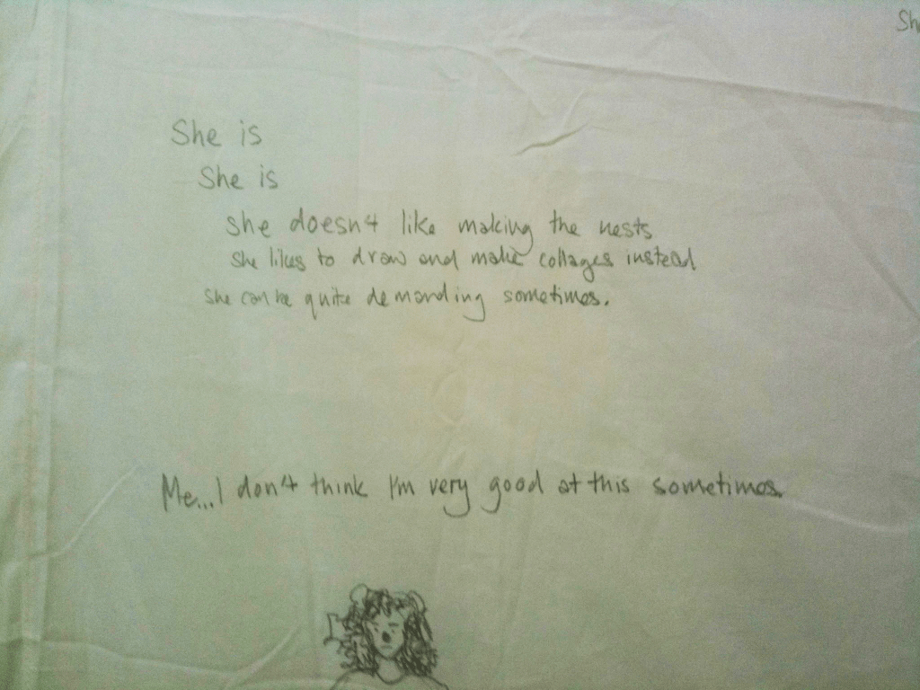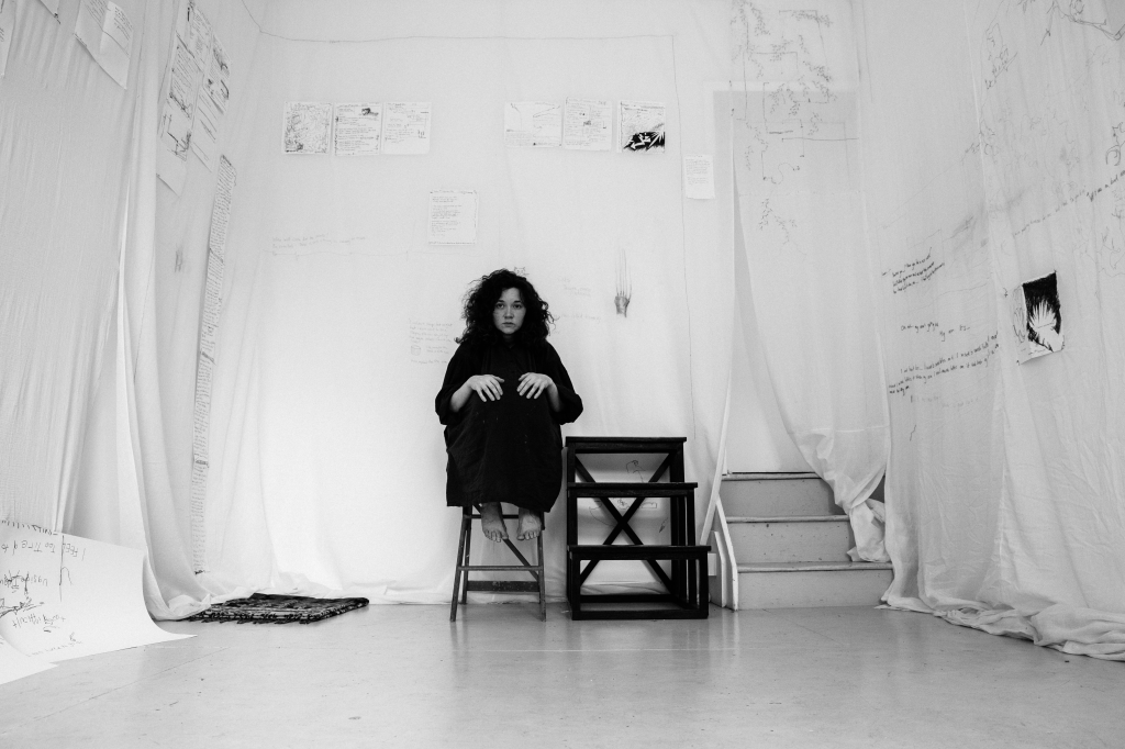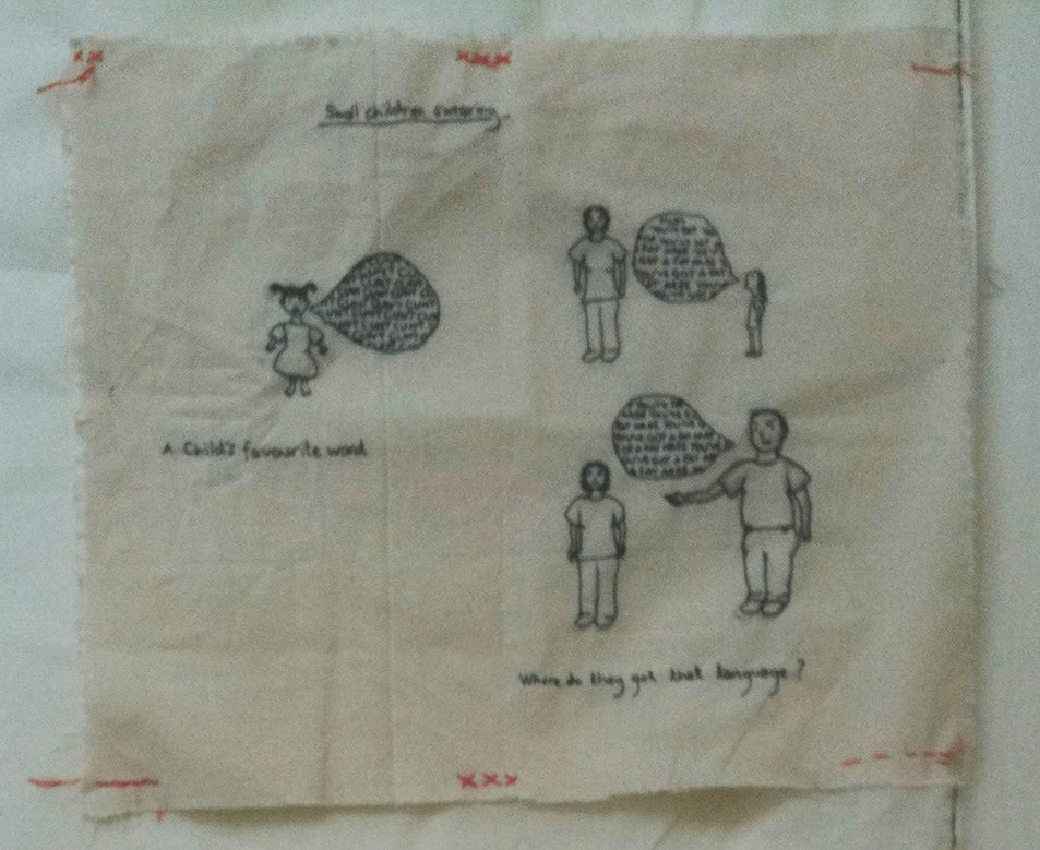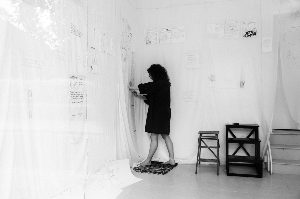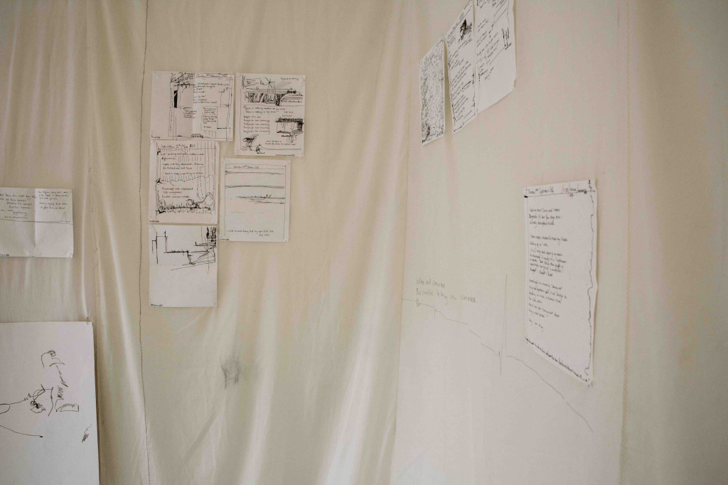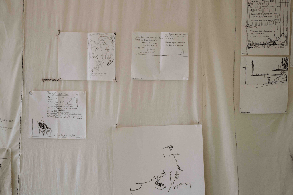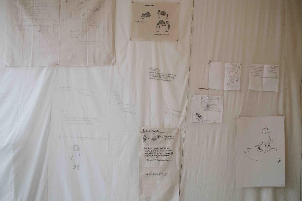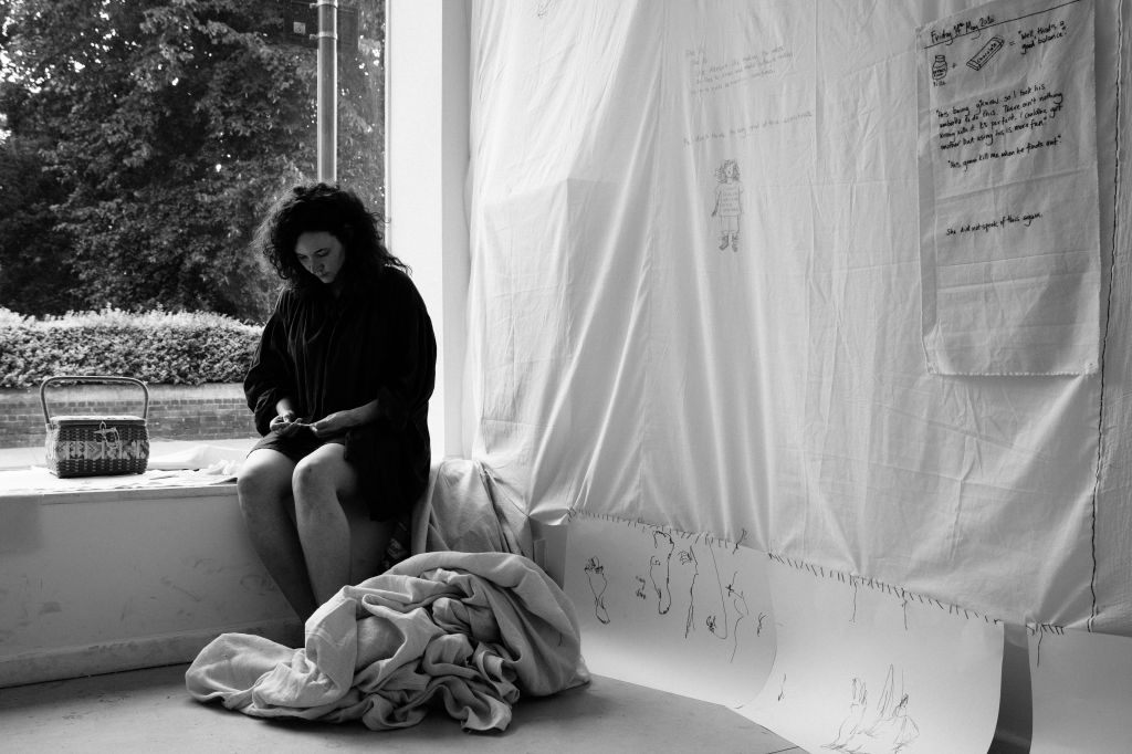 The installation of We Are the Spaces That I Am had sheets of fabric attached to the walls of the space to give the idea of a cell, further sheets of fabric were attached within the space. These pieces were embroideries based on conversations I had with the participants of a women’s art therapy group, Sweet Arts, I volunteered with. In the performance I situated myself in the space stitching new pieces of embroidery that were then added to installation.
