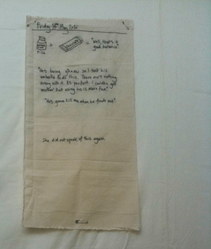 We Are the Spaces That I Am 2010 – 2015 is a project that looked at the history of embroidery and female mental health. I had been using embroidery for a year or so running up to this project as I had been looking at my own history with the medium. My maternal grandmother had taught me various creative techniques and mediums but for some reason embroidery is an action and aesthetic that stuck with me, eventually becoming a key part of my visual language. I had wanted to create a project with a performative aspect for my MA final piece that could also be shown as an installation (though if I’d had the chance I would’ve wanted to install myself in the space for a week).